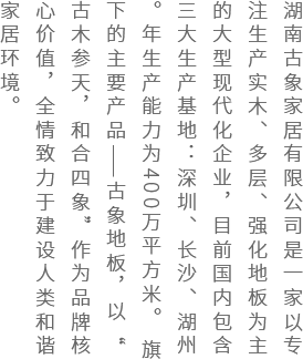 古象地板是湖南古象家居有限公司旗下的品牌,是專注于生產實木、多層、強化地板的木地板廠家,目前國內包含三大生產基地:深圳、長沙、湖州。年生產能力為400萬平方米。品牌成立多年以來,以強大的實力和盡善盡美的產品以及誠信經營獲得廣大用戶和合作伙伴滿意和信任,古象地板已經廣泛應用于國內各大城市的樓盤、酒店、公共區(qū)域。